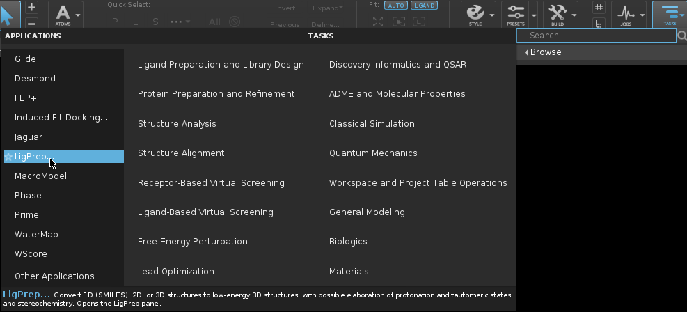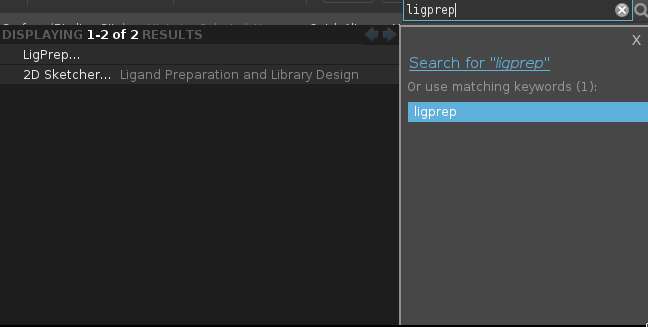 メニューに表示されている場合はそのまま選択し、ない場合はSearch欄に「Ligprep」と打ち、Ligprep>Ligprep…をクリックします。