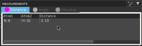 このツールボックスには、ワークスペースに現在表示されている各測定タイプのタブが含まれています。 測定のマーカーの色は、タブラベルの隣に表示されます。パネル内の測定行をダブルクリックしてワークスペースをその測定値に合わせるか、右クリックして次のアクションを含むコンテキストメニューを開くことができます。